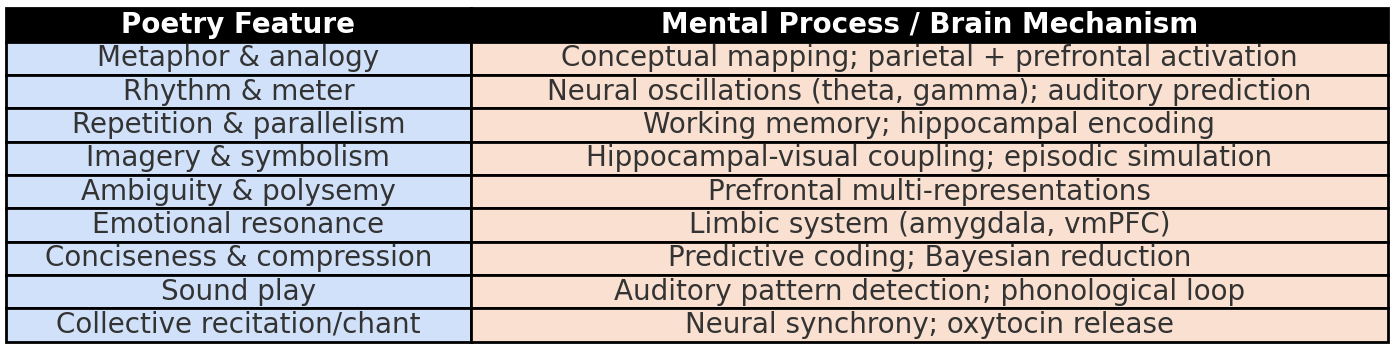 Poetic language is characterized by a set of features that make it different from ordinary discourse. It relies on metaphor and analogy, where abstract concepts are expressed through vivid cross-domain mappings that make complex ideas more graspable. Repetition and parallelism reinforce memory and create a sense of cohesion, while imagery and symbolism compress layered meanings into concise and evocative forms. Unlike strictly literal language, poetic language embraces ambiguity and polysemy, sustaining multiple interpretations simultaneously and inviting flexible thought. Its power is heightened through sound play, including rhyme, meter, alliteration and assonance, which exploit the brain’s sensitivity to auditory regularities and contribute to structure expression and guide attention. Poetic language often fosters emotional resonance and collective synchrony, linking individual cognition to shared experience.