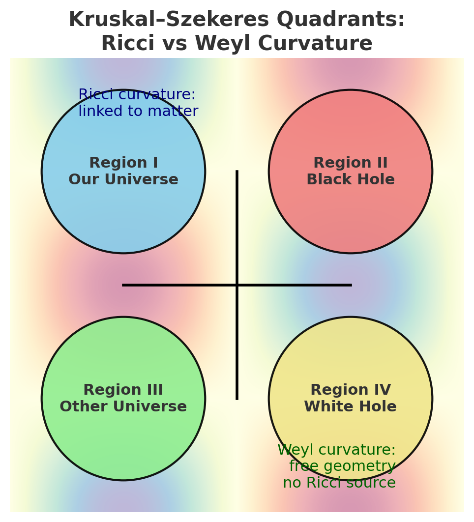 Overall, Regions III and IV, usually dismissed as nonphysical extensions, may instead be understood as illustrations of curvature’s autonomy from energy. Their interpretation as manifestations of pure Weyl dynamics broadens the framework of general relativity, highlighting geometry as an independent actor rather than a passive reaction to matter.